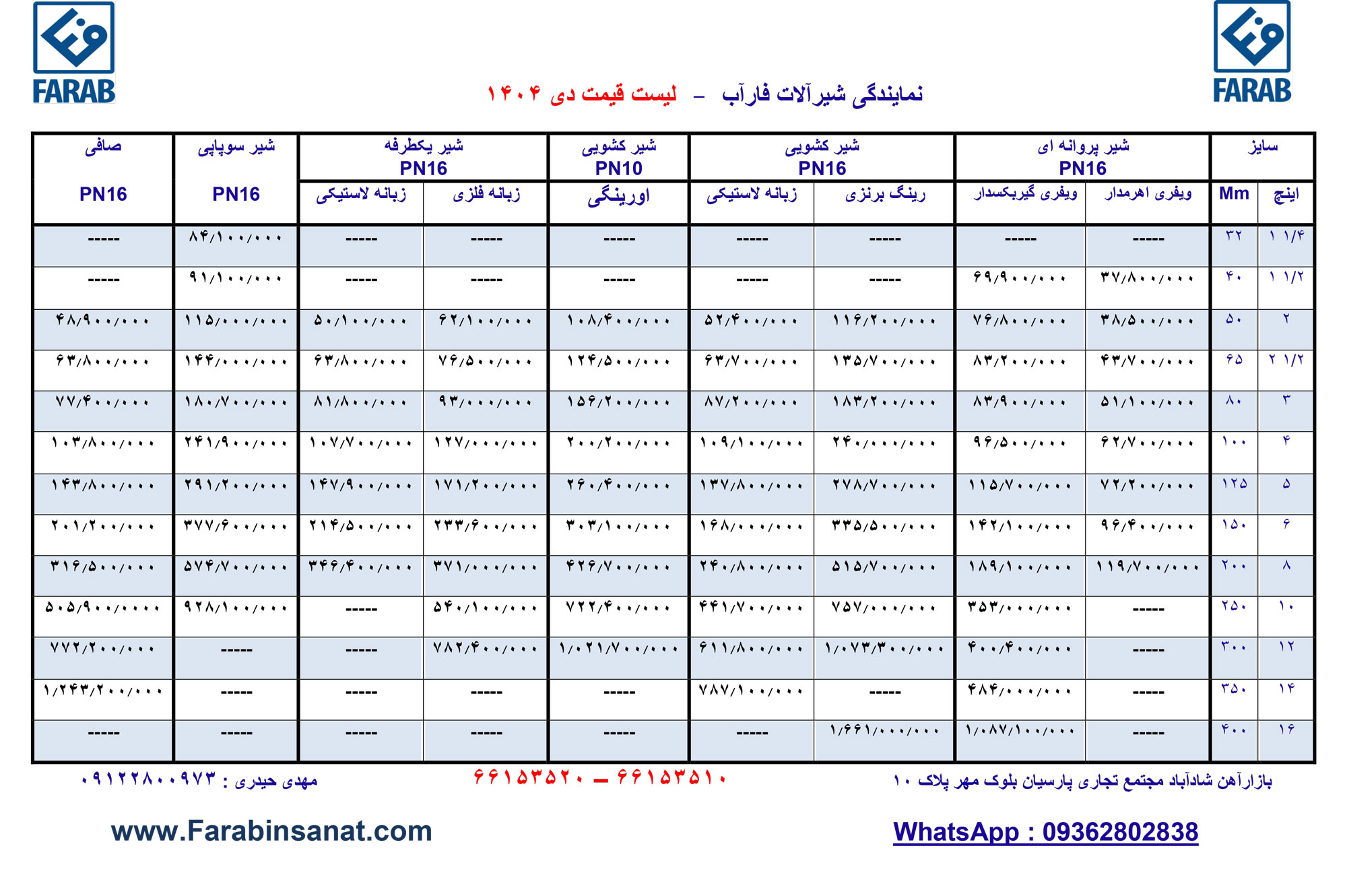 لیست قیمت شیرآلات فاراب
